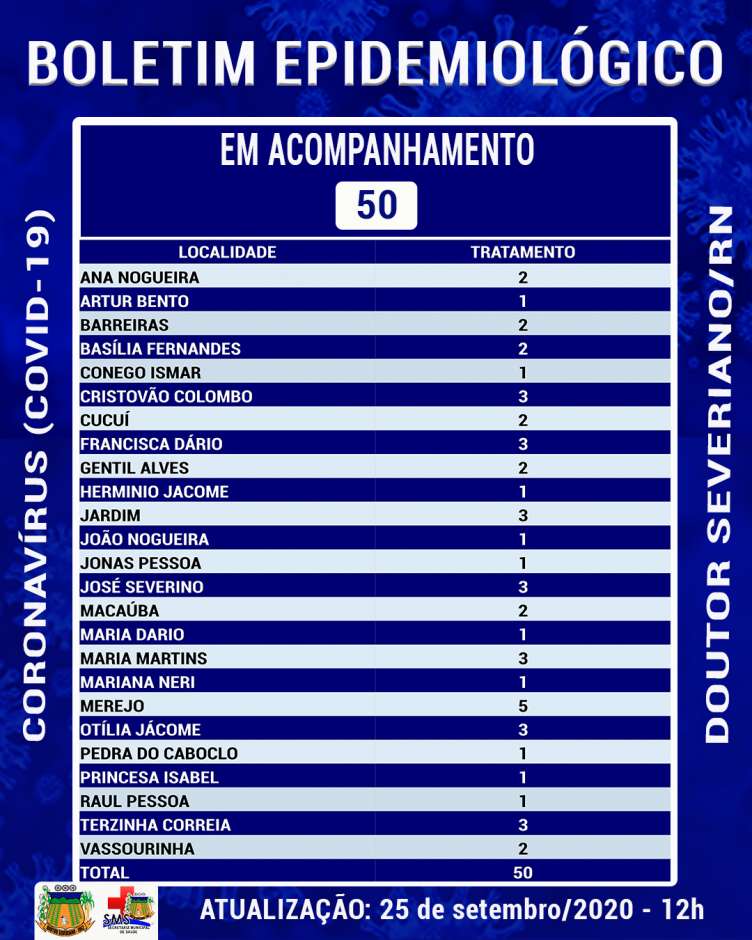 Dos casos confirmados até as 12 horas de hoje, 25 de setembro de 2020, 50 pacientes estão em acompanhamento.